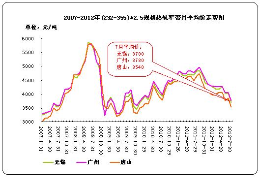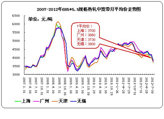 据中华商务网监测数据显示,2012年7月我国11个主要市场热轧中宽带月平均价格3772元/吨,与上月相比跌330元/吨。其中天津、无锡、上海、广州四个主要市场7月平均价格分别为3730元/吨、3800元/吨、3700元/吨、3860元/吨,分别较上个月跌270元/吨, 380元/吨, 410元/吨和260元/吨。从窄带和宽带的跌幅来看,宽带受热卷冲击较大,下跌幅度更多一些,且受电子盘影响较大的上海及无锡华东地区宽带下调更明显一些。