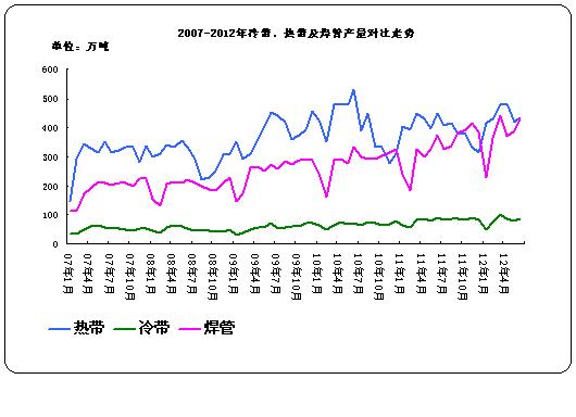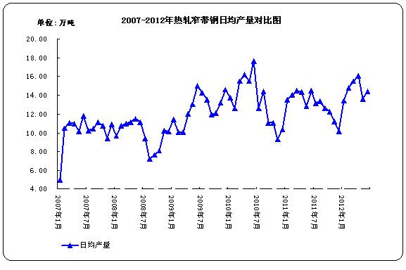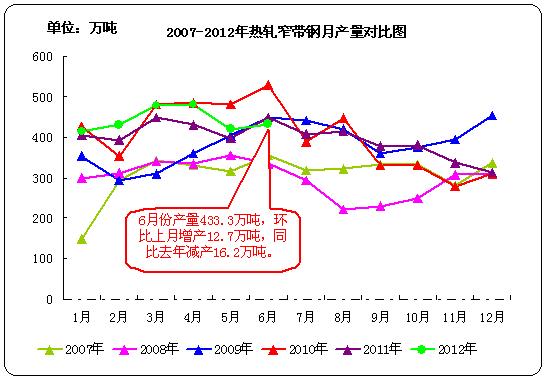 据中华商务网监测数据显示, 2012年6月份国内热轧窄带钢产量433.3万吨,环比增产12.7万吨,日均产量14.44万吨,日均环比增长6.41%;比去年同期产量449.5万吨减产16.2万吨,同比减少3.6%。2012年6月我国冷轧窄带产量88.5万吨,环比增产8.2万吨,日均产量2.95万吨,日均环比增长13.9%;比去年同期产量92.1万吨减产3.6万吨,同比减少3.91%。
