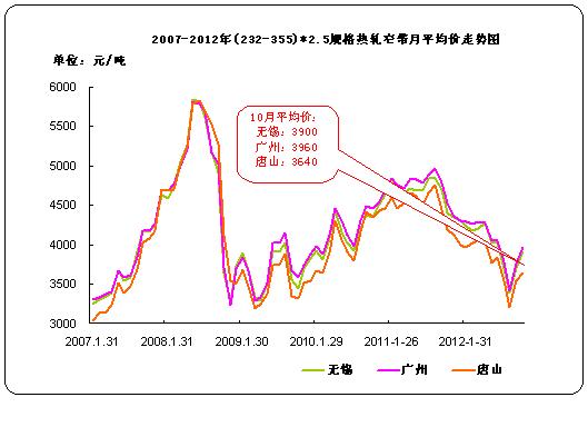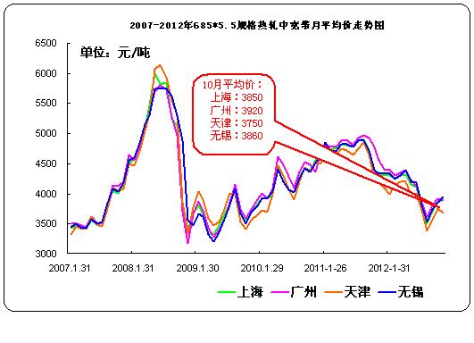 据中华商务网监测数据显示,2012年10月我国11个主要市场热轧中宽带月平均价格3845元/吨,与上月相比涨192元/吨。其中天津、无锡、上海、广州四个主要市场10月平均价格分别为3750元/吨、3860元/吨、3850元/吨、3920元/吨,分别较上个月涨200元/吨, 130元/吨, 150元/吨和120元/吨。
