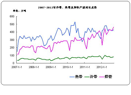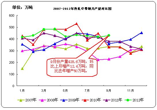 据中华商务网监测数据显示, 2012年9月份国内热轧窄带钢产量428.6万吨,环比增产12.4万吨,日均产量14.29万吨,日均环比增长6.40%;比去年同期产量378.6万吨增产50万吨,同比增长13.21%。2012年9月我国冷轧窄带产量83.1万吨,环比增产6.5万吨,日均产量2.77万吨;比去年同期产量87万吨减产3.9万吨。