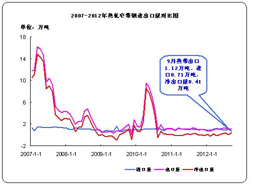 据中华商务网监测数据显示, 2012年9月份进口热轧窄带钢0.71万吨,出口1.12万吨,净出口0.42万吨。9月份新增资源量428.18万吨。
