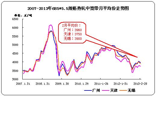 据中华商务网监测数据显示,2013年2月我国11个主要市场热轧中宽带月平均价格3870元/吨,与上月相比跌70元。其中天津、无锡、广州四个主要市场2月平均价格分别为3750元/吨、3900元/吨、3960元/吨,分别较上个月跌30元/吨,100元/吨,跌60元/吨。