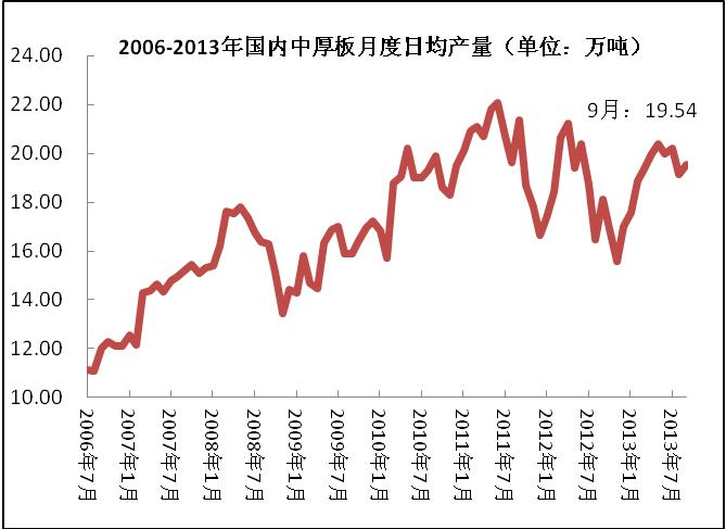 2013年9月份国内中厚板产量为586.3万吨,同比增长7.8%,环比下降1.28%。1-9月份国内中厚板累计产量为5316万吨,较去年同期增加133.7万吨。9月份特厚板以及厚板增幅居前;1-9月份累计产量方面,特厚板同比增加较为明显,增幅高达30.6%。