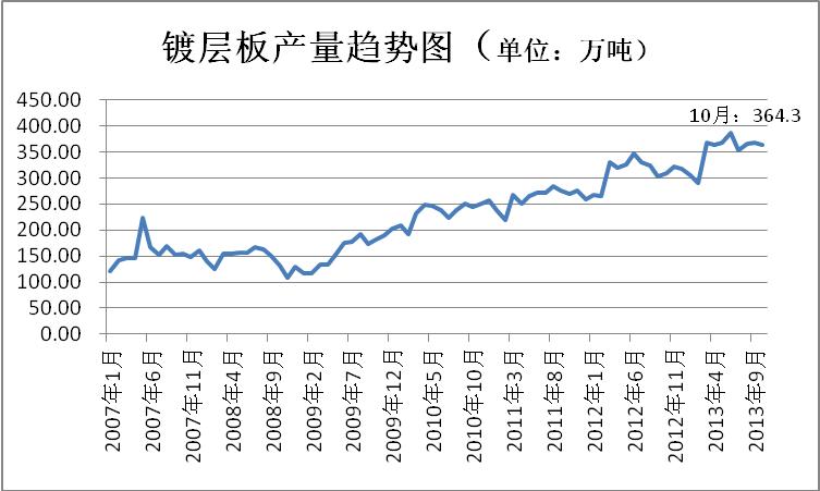 镀层板10月产量为364.3万吨,环比下降0.71%;同比增长17.78%。1-10月份国内共生产镀层板3509.3万吨。