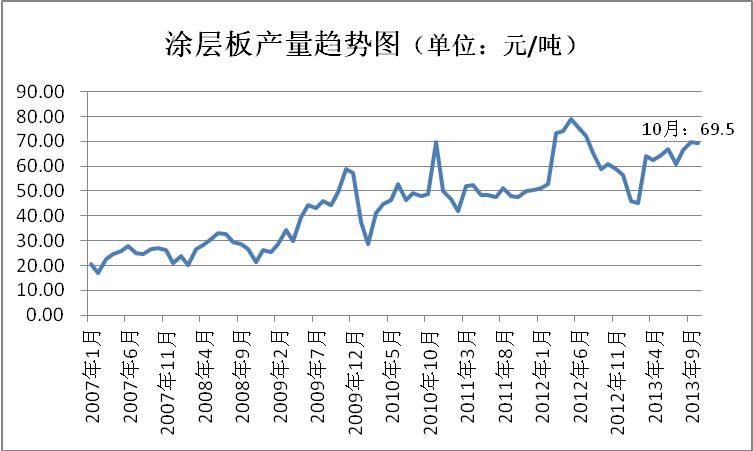 涂层板10月产量为69.5万吨,环比下降0.57%;同比增长13.93%。1-10月份国内共生产涂层板622.6万吨。
