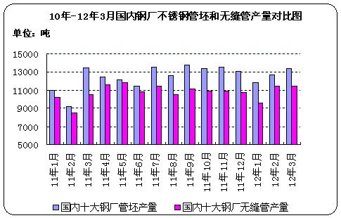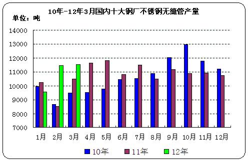 12年3月国内十大钢厂不锈钢管坯和无缝管产量环比都小幅增加,国内十大钢厂不锈钢管坯产量13400吨,环比增加5.51%,国内十家不锈钢无缝管产量11500吨,环比增加0.17%。行情低迷,各大钢厂产量增加不大。