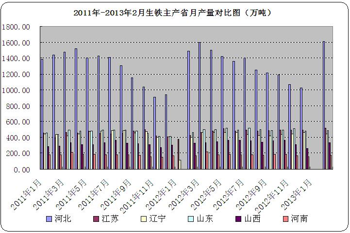 (上图为2011年-2013年2月生铁主产省月产量对比图)