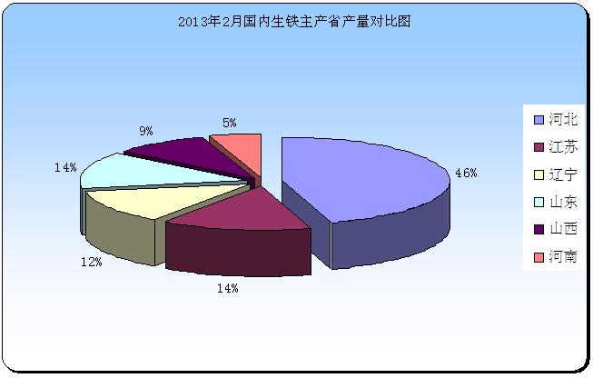 2013年2月中国生铁产量5705.4万吨,约占全球总产量的62.01%,同比增加363.8万吨,增幅为6.8 %;日均产量为203.76万吨,较13年1月份的189.47 万吨减少14.29 万吨。