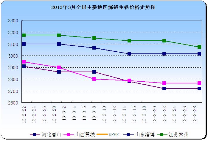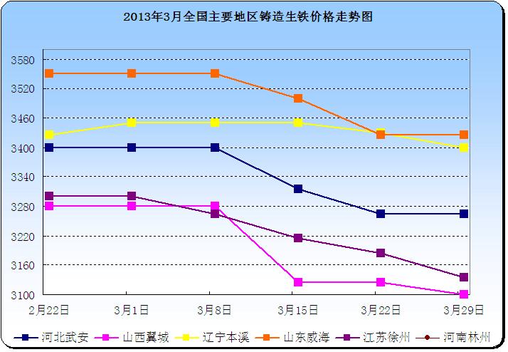 下图为2013年3月全国主要地区铸造生铁价格走势图