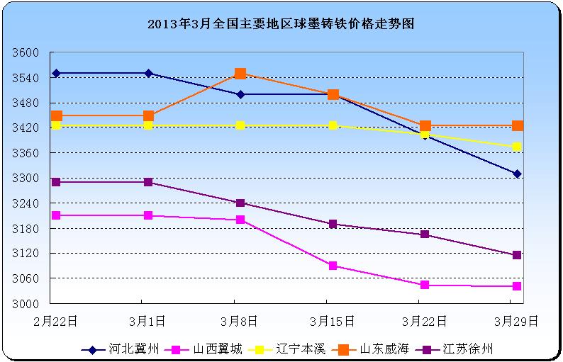 下图为2013年3月全国主要地区球墨铸铁价格走势图