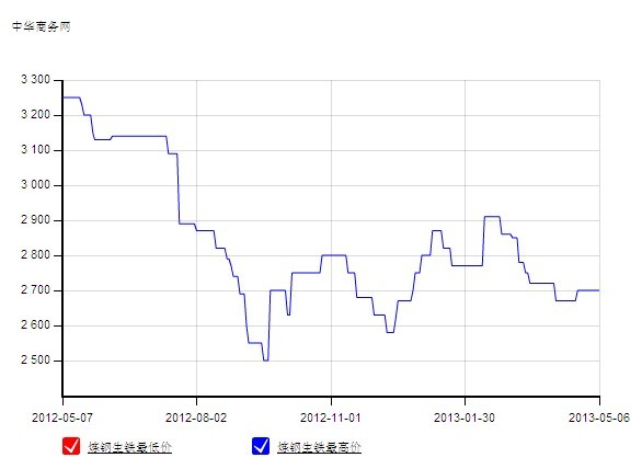 (下图为2012年5月6日-2013年5月6日唐山地区炼钢生铁价格走势图,价格取的为上限价格)