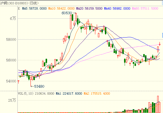 中华商务网讯:在连续两日大涨累计超200美元的伦铜带领下,沪期铜亦上演两连跳,今日沪期铜主力合约1303跳空高开520元/吨于57490元/吨,高位受阻57750元/吨,收报57550元/吨,上涨580元/吨,涨幅1.02%。仓量方面,主力合约成交量减少12.2万手,持仓量增加9822手。