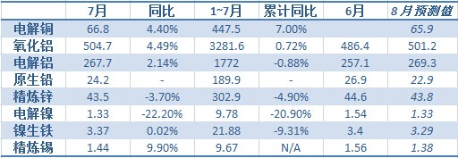 7月精炼锡产量同比增长9.9%,环比减少7.8%,减少原因是7月中旬中央环保督查组进入锡主产区,导致所涉地区冶炼厂集中停产,主要为云南、广西和江西地区;另有个别安徽地区企业受到暴雨侵袭被迫停产数日,产量有所减少。8月精炼锡产量预计为1.38万吨,环比减少4.2%,主要考虑到8月上半月上述地区企业仍多数处于停产状态。本次集中停产中,部分企业暂停污染较重的冶炼环节,而7月份停产伊始仍可以精炼前期产出的中间产物,因此7月份受影响不大;8月份由于粗炼等环节停产导致中间原料减少,影响成品的最终产出,预计8月份整体产量还将较7月份进一步小幅下降。