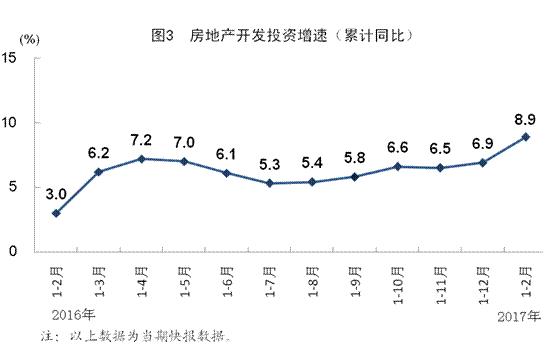 1-2月份,全国房地产开发投资9854亿元,同比增长8.9%,增速比上年全年加快2.0个百分点,比上年同期加快5.9个百分点,其中住宅投资增长9.0%。房屋新开工面积17238万平方米,同比增长10.4%,其中住宅新开工面积增长14.8%。全国商品房销售面积14054万平方米,同比增长25.1%,其中住宅销售面积增长23.7%。全国商品房销售额10806亿元,同比增长26.0%,其中住宅销售额增长22.7%。房地产开发企业土地购置面积2374万平方米,同比增长6.2%,上年全年为下降3.4%。2月末,全国商品房待售面积70555万平方米,比上年同期下降4.6%。1-2月份,房地产开发企业到位资金22880亿元,同比增长7.0%。1月份,15个一线和热点二线城市中,11个城市新建商品住宅价格环比下降,3个城市持平,1个城市涨幅回落。三、四线城市去库存力度加大,1-2月份非重点城市商品房销售面积同比增长35.9%,增速比上年全年加快14.0个百分点。