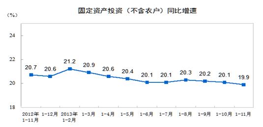 2013年1-10月份,全国固定资产投资351669亿元,同比名义增长20.1%,增速比1-9月份回落0.1个百分点。但10月固定资产投资增长仍低于前9个月平均近一个百分点%。1-11月份,全国固定资产投资(不含农户)391283亿元,同比名义增长19.9%,增速比1-10月份回落0.2个百分点。其中11月份与前10月平均下降2个百分点。下降幅度呈现增加的趋势。