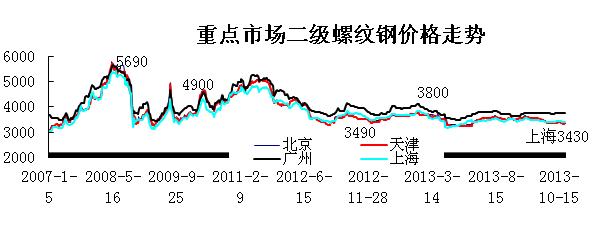 三次演绎的这个经济下滑和拉动经济稳定的规律性似乎让我们看清了中国经济未来的变化趋势。面对过剩经济形态,只要改革还没有释放经济活力和拉动力,就需要适度增加投资拉动,才能保持经济稳定。毕竟国际经济在疲软中震荡;毕竟中国钢铁需求步入高消费低增长时期;这种经济运行态势必然带来包括铁矿石、钢材在内的市场价格的小幅波动走势。从钢材市场价格走势图中已经可以看出这种小幅波动走势特点的大趋势。